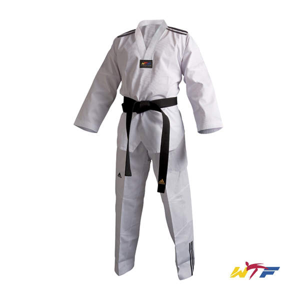 adidas Club /// taekwondo dobok. Osvježenje iz adidas taekwondo programa. Vrhunski dizajn s tri crte. Rebrasti materijal u kombinaciji poliestera i pamuka. Odobrenje svjetske taekwondo federacije WTF za sva natjecanja i trening. Pojas nije uključen u cijenu.